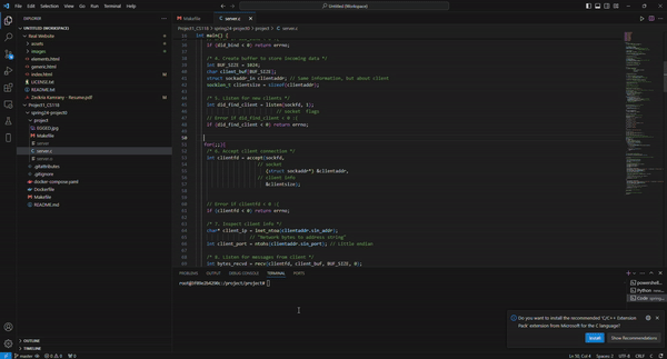 Utilized socket programming to handle client TCP connections and serve HTTP requests, parsing incoming requests to extract file paths and serve requested files. Managed socket and file descriptor lifecycles, ensuring proper closure to avoid resource leaks.