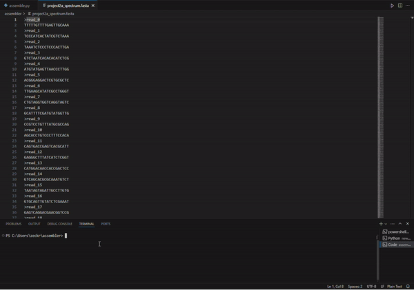 The genome assembly process (coded in Python) using De Bruijn graphs involves breaking DNA reads into k-mers, constructing a graph where nodes represent (k-1)-mers and edges represent k-mers, finding an Eulerian path through the graph, and reconstructing the genome by traversing this path and combining the nodes to form the original sequence.