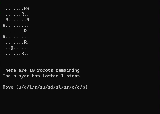 A turn-based game (also coded in C++) where you are surrounded by robots. You can move up, down, left, and right in order to shoot down all of the robots!